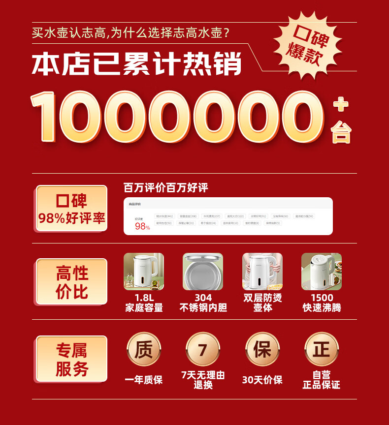 志高(CHIGO)燒水壺電熱水壺電水壺雙層防燙1.8L大容量家用燒水壺304不銹鋼內膽大功率快速燒水