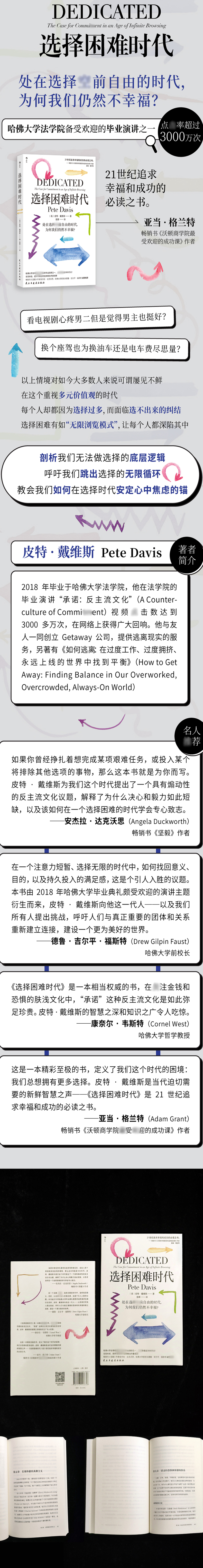 本書作者皮特·戴維斯是美國頗具創意、極能鼓舞人心的年輕作家之一,2018年于哈佛大學畢業典禮發表“承諾:反主流文化”的演講,他將現代人選擇困難這種時代頑疾定義為“無限瀏覽模式”。戴維斯觀察到現代生活的主要緊繃壓力之一:從休閑活動、約會對象、職場生涯,到用餐的餐廳,千禧一代都渴望找到最好的,因此不想草率做決定。結果無論工作、戀愛、人生興趣,都只是陷入無止境的旁觀。