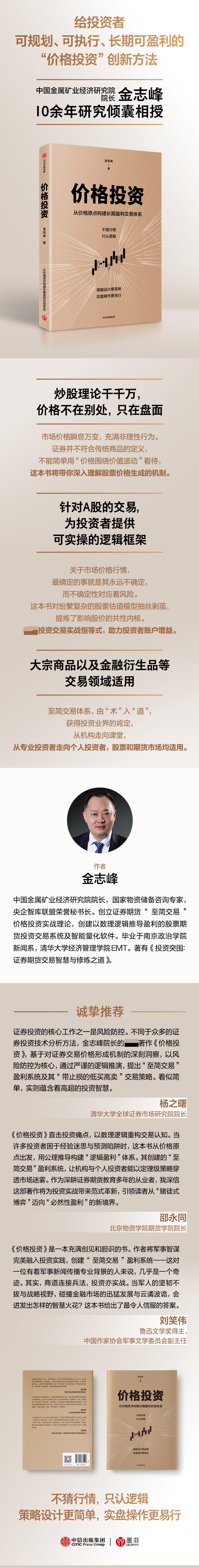 這本書提煉了盈利三寶,即價差、勝率和盈虧比;總結了價格的特性,包括周期、方向、邊界、速度等;為投資者梳理價格背后的確定性邏輯,糾正盲目抄底、無撤退計劃等錯誤認知;助力投資者在價格投資的指導下構建投資組合,達到長期盈利。