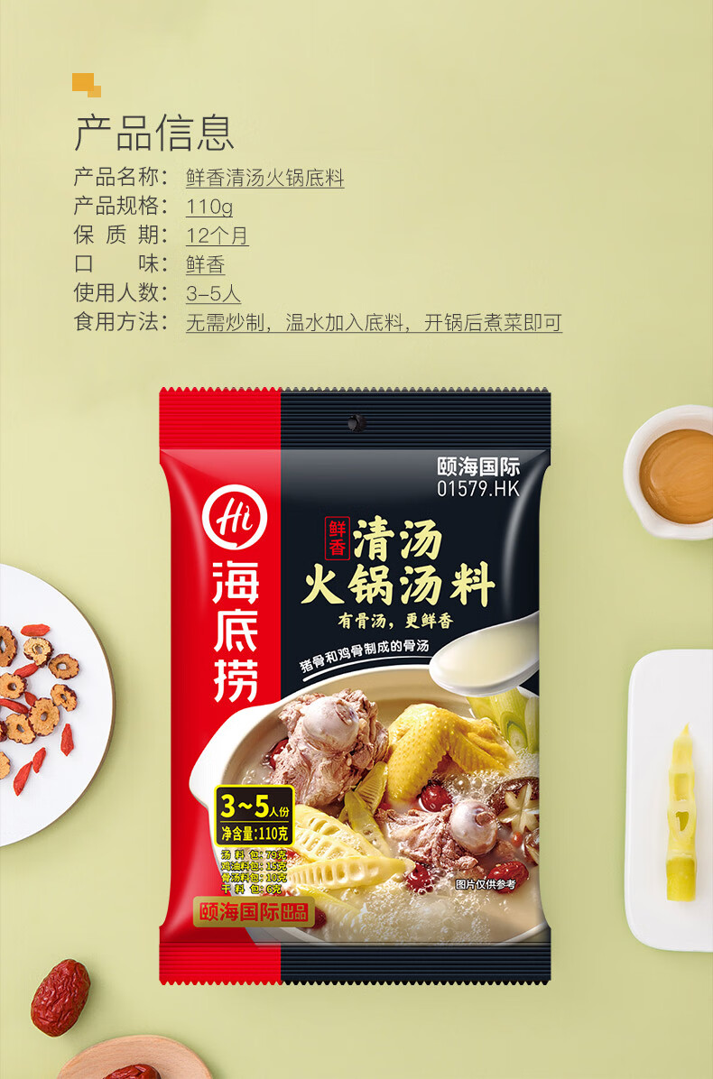 海底撈 火鍋底料 鮮香清湯火鍋底料110g 3~5人份骨湯鮮香 一料多用