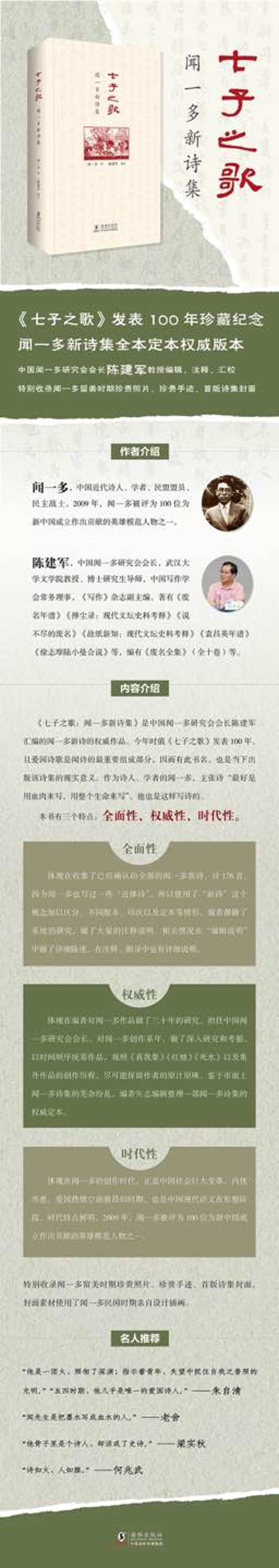 真我集雨夜/003月亮和人/004讀沈尹默《小妹》!想起我的妹來了也作一首/005雪片/006朝日/007雪/008忠告/010率真/011志愿/012傷心/014一個小囚犯/015黃昏/018所見/019南山詩(古詩今譯)/020晚霽見月/022紅燭 序詩/025紅燭/025李白篇/029李白之死/031劍匣/041西岸/051雨夜篇/059雨夜/061雪/062睡者/064黃昏/066時間底教訓/068二月廬/070印象/071快樂/073美與愛/074詩人/076風波/078回顧/080幻中之邂逅/081志愿/083失敗/085貢臣/086游戲之禍/087花兒開過了/088十一年一月二日作/090死/092深夜底淚/094青春篇/097青春/099宇宙/100國手/101香篆/102春寒/103春之首章/104春之末章/107鐘聲/114愛之神/115謝罪以后/116懺悔/118黃鳥/119藝術底忠臣/121初夏一夜底印象/123詩債/125紅荷之魂/126別后/129孤雁篇/131孤雁/133太平洋舟中見一明星/137火柴/140玄思/141我是一個流囚/143寄懷實秋/146晴朝/148記憶/151太陽吟/152憶菊/155秋色/159秋深了/164秋之末日/166廢園/167小溪/168稚松/169爛果/170色彩/171夢者/173紅豆篇/175紅豆(共四十二首)/177死水 口供/199收回/200“你指著太陽起誓”/201什么夢?/202大鼓師/204狼狽/210你莫怨我/212你看/214也許/217忘掉她/220淚雨/222末日/224死水/226春光/228黃昏/229我要回來/230夜歌/232心跳/233一個觀念/235發現/236祈禱/237一句話/239荒村/240罪過/243天安門/245飛毛腿/248洗衣歌/250聞一多先生的書桌/255集外詩一句話也不講/259笑/260園內/262Another “Chinee” Answering/280相遇已成過去/285漁陽曲/288大暑/296閨中曲/298醒呀!/300七子之歌/303長城下之哀歌/308愛國的心/318我是中國人/319回來了/324故鄉/326叫賣歌/328納履歌/330南海之神/332秦始皇帝/340抱怨/341唁詞—紀念三月十八日的慘劇/342欺負著了/344比較 /347鳥語/348往常/350貢獻/351答辯/352回來/353回來/354奇跡/355八教授頌/358附錄 一首跨越時空的戰歌——紀念《七子之歌》發表100周年/365聞一多詩集《紅燭》出版始末/374編后記/395