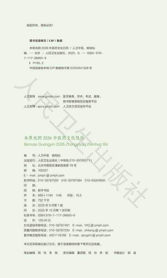 本草光陰日歷自2018年出版以來(lái),很受讀者喜愛(ài)。隨后每年出一本,市場(chǎng)影響力逐年上升,已經(jīng)成為人衛(wèi)社文化品牌產(chǎn)品?!侗静莨怅?026中醫(yī)藥文化日歷》以中醫(yī)藥文化為主題,以服務(wù)健康為宗旨,內(nèi)容以中醫(yī)藥文化與養(yǎng)生知識(shí)為主,通過(guò)優(yōu)美精煉的文字和插圖,傳遞中醫(yī)藥文化知識(shí),展現(xiàn)中醫(yī)藥與傳統(tǒng)文化的交融。本書(shū)選擇常用中藥153種,以本草功效為線(xiàn),內(nèi)容主要包括本草知識(shí)、傳統(tǒng)節(jié)日文化、二十四節(jié)氣養(yǎng)生與導(dǎo)引、養(yǎng)生箴言、中醫(yī)古籍介紹、博物館里的中醫(yī)、養(yǎng)生藥膳與茶飲等。特別設(shè)置馬年專(zhuān)題,展現(xiàn)生肖馬文化與中藥的內(nèi)在聯(lián)系。進(jìn)一步豐富數(shù)字資源內(nèi)容,包括3D藥材展示、食療藥膳制作視頻等,增加互動(dòng)性和趣味性。本書(shū)配有精美的本草手繪圖以及藥材圖片,使讀者在不知不覺(jué)中領(lǐng)悟到博大精深的中華傳統(tǒng)文化。]]>