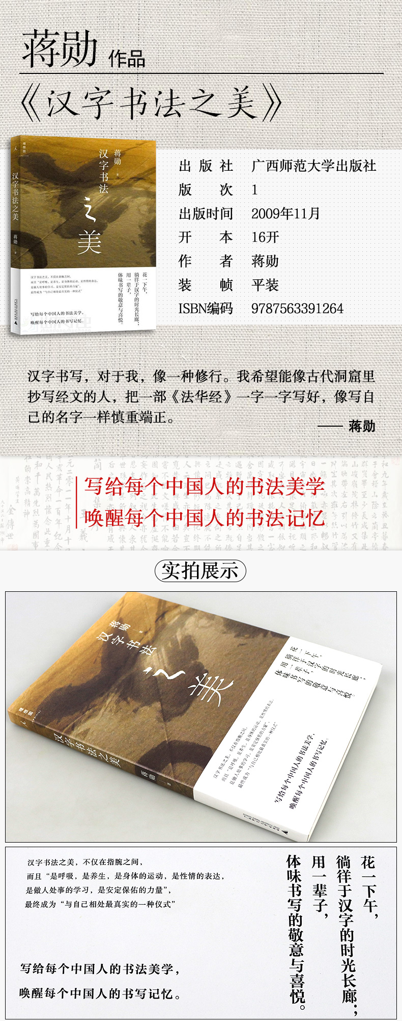《漢字書法之美》是寫給每個(gè)中國人的書法美學(xué),喚醒每個(gè)中國人的書寫記憶。作者以其獨(dú)特的美學(xué)情懷,述說動(dòng)人的漢字書法故事。文字編織成畫面,我們走進(jìn)了那古老卻又現(xiàn)代的漢字時(shí)間光廊,東方書寫的敬意與喜悅,就在你我的指間心中!