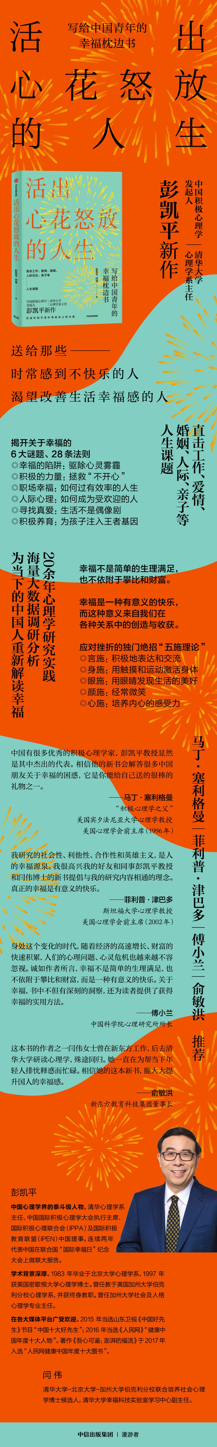 清華大學心理學系主任彭凱平教授結合20余年的心理學研究實踐,對比了中西方文化看待幸福的差異性,為當下的中國人重新解讀幸福。幸福不是簡單的生理滿足,也不依附于攀比和財富。幸福是一種有意義的快樂,而這種意義來自我們在工作、愛情、婚姻、人際交往、親子等人生課題中的創造與收獲。